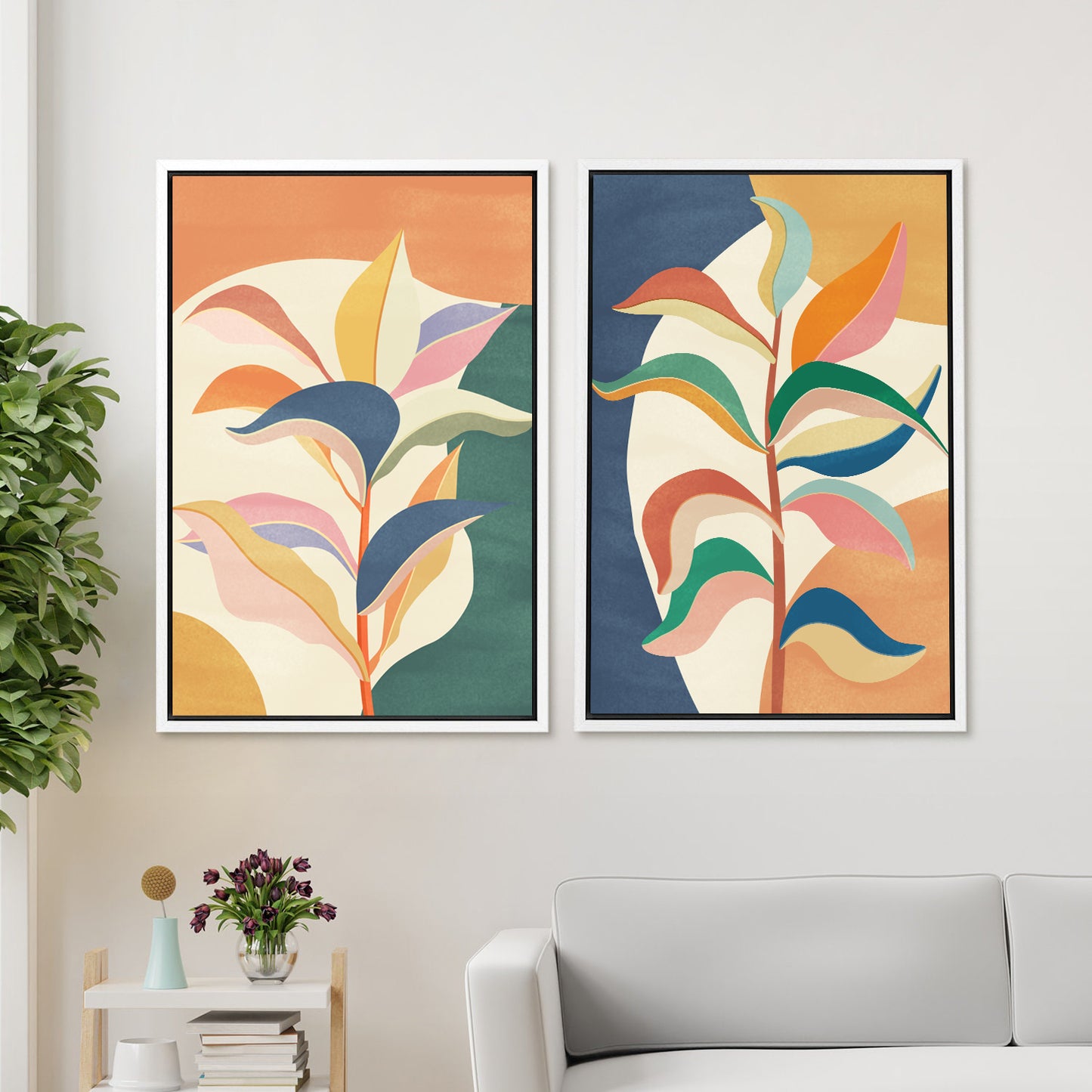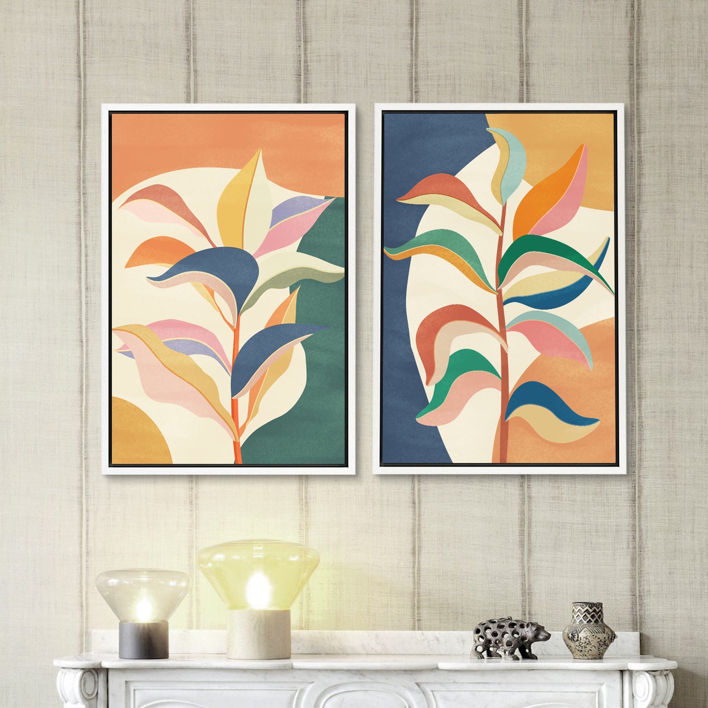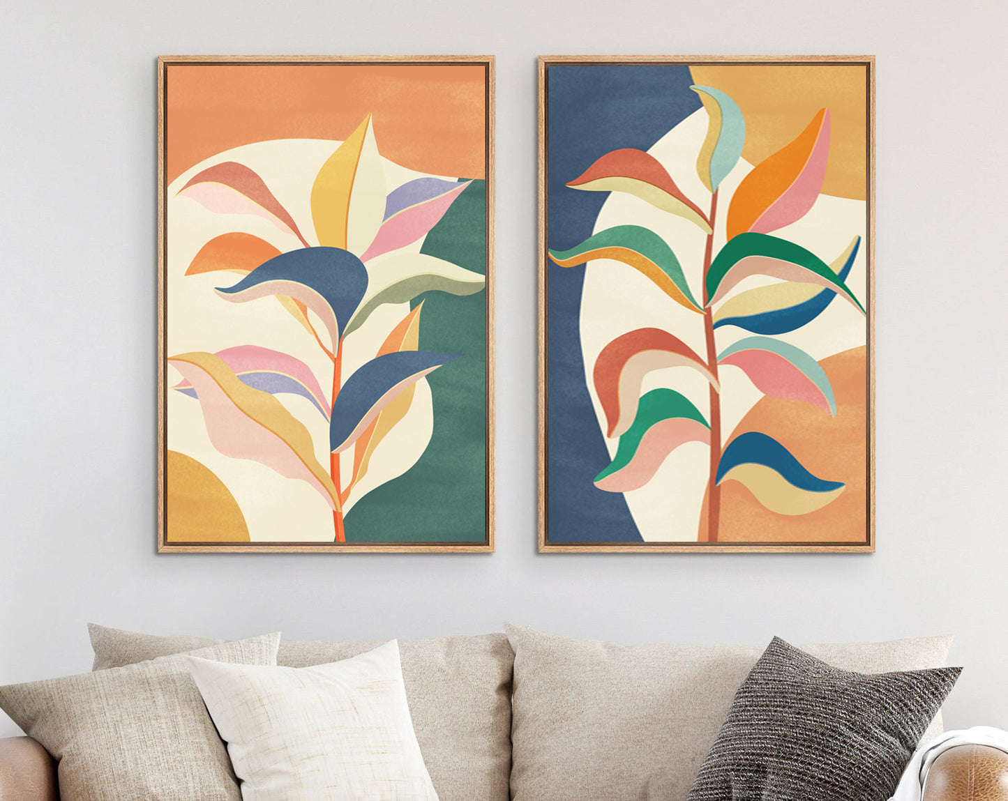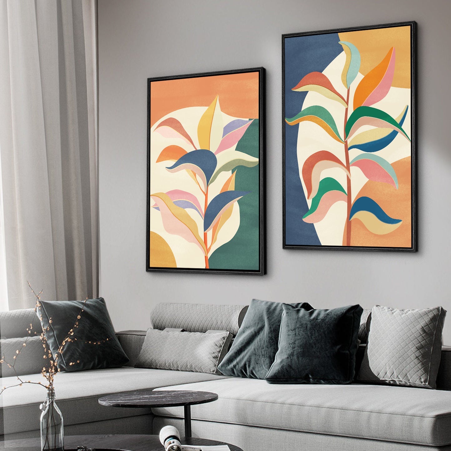 Framed Canvas Wall Art Set of 2 Colorful Tropical Jungle Leaf Botanical Prints Minimalist Modern Art Boho Wall Decor